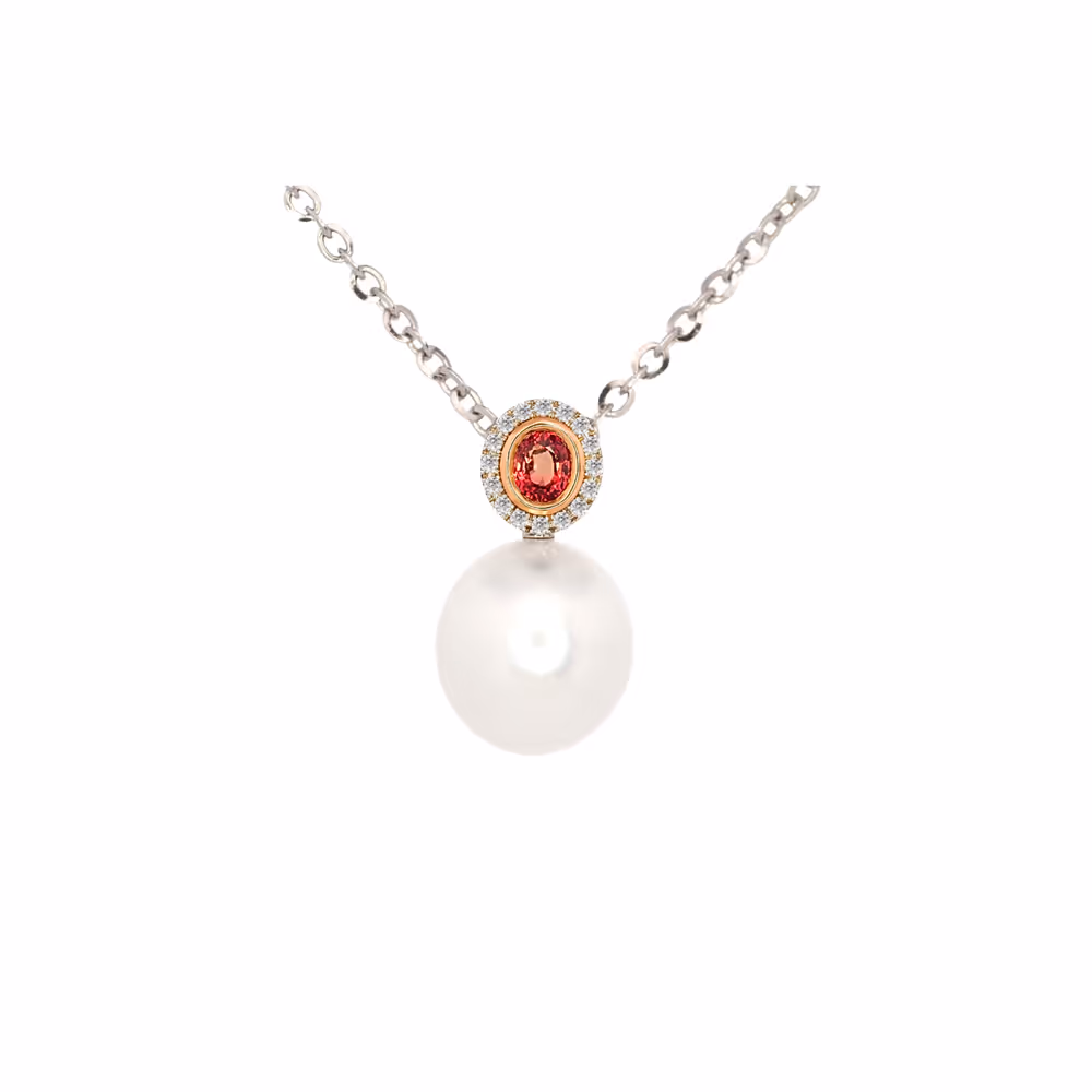 Part of an alluring classic collection of coloured natural Sapphires and Pearl pendants. A stunning piece with a lustrous white South Sea Pearl. Gracefully complimented by an oval-cut Red-Orange Sapphire and a radiant white diamond halo. Mastered in the shine of a Platinum & 18kt Rose Gold setting.