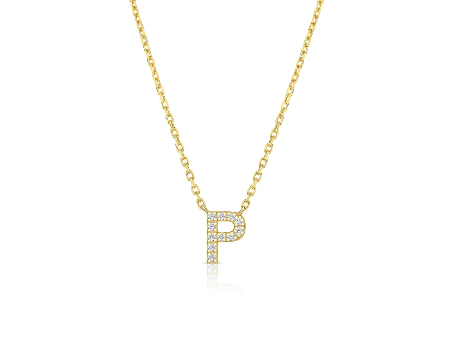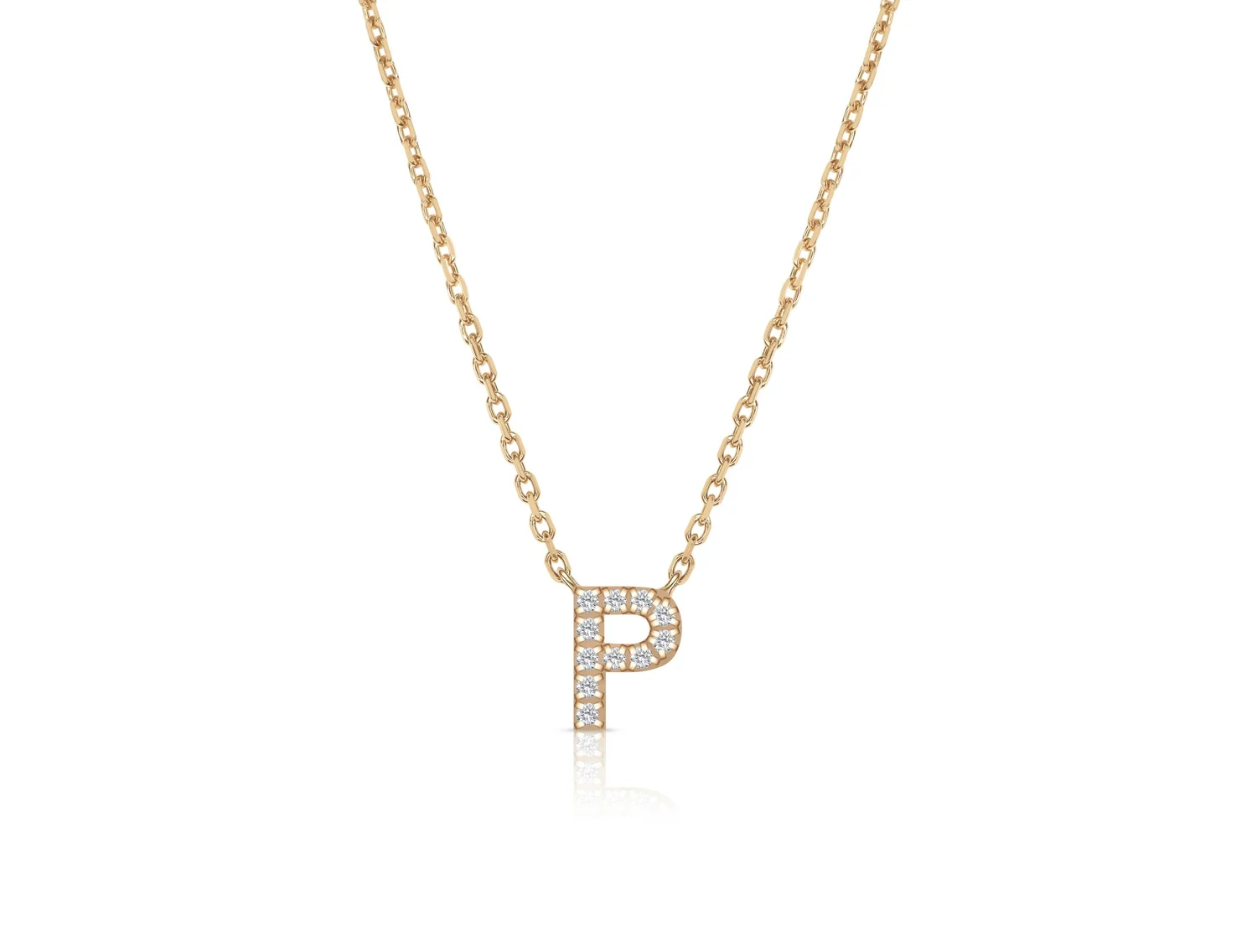 An elegant letter "P" stacking necklace, adjustable from 42-45cm. Set with radiant brilliant cut white natural diamonds of a D-E/VVS-VS grading.